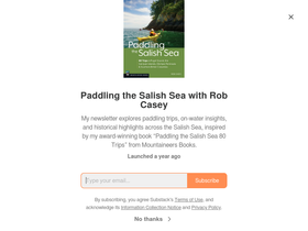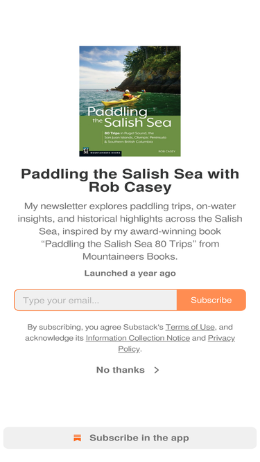 68%Join me in exploring trips from my book "Paddling the Salish Sea 80 Trips" with routes thru Puget Sound, the Olympic Peninsula, and the San Juan Islands, Vancouver, Victoria, and the Gulf Islands. Click to read Paddling the Salish Sea, 80 Trips with Rob Casey, a Substack publication with hundreds of subscribers.