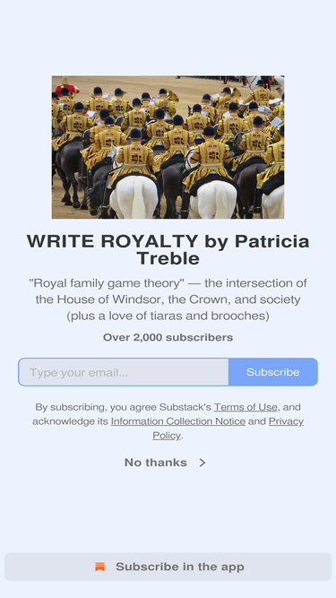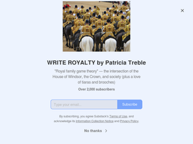 81%"Royal family game theory" — the intersection of the House of Windsor, the Crown, and society (plus a love of tiaras and brooches). Click to read WRITE ROYALTY by Patricia Treble, a Substack publication with thousands of subscribers.