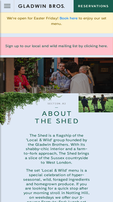 A farm-to-fork restaurant in Notting Hill, a short walk from Notting Hill Gate station. The Shed restaurant is the Gladwin Brother's serves seasonal British, wild, and foraged small plates served with English wine and signature cocktails. Outdoor dining can be enjoyed in our cosy terrace. We are the perfect Notting Hill lunch and dinner spot.