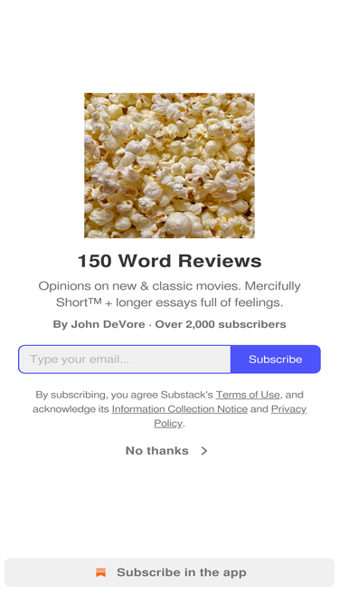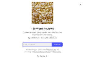 86%Opinions on new & classic movies. Mercifully Short™ + longer essays full of feelings. Click to read 150 Word Reviews, by John DeVore, a Substack publication with thousands of subscribers.