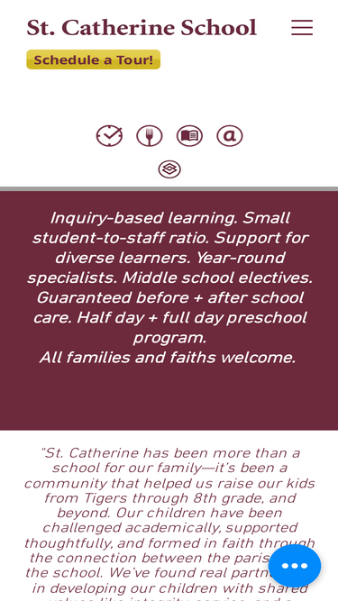 St. Catherine welcomes all families, offers small class sizes (preschool - 8th grade), differentiated instruction, and before + after school care.