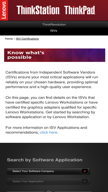 100%Certifications from Independent Software Vendors (ISVs) ensure your most critical applications will run reliably on your chosen hardware, providing optimal performance and a high-quality user experience. On this page, you can find details on the ISVs that have certified specific Lenovo Workstations or have certified the graphics adapters qualified for specific Lenovo Workstations. Get started