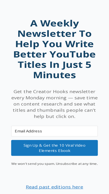 85%I’ve asked some of the best creators on YouTube, “How do you write such great titles?” And they’ve all said the same thing: “I just model what works.” So this email will show you 5 videos worth modeling to help you write great titles and save time. P.S. If you want to save more time ... Read more