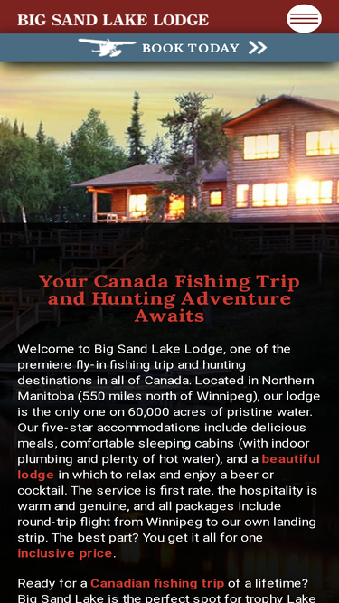 80%big sand lake lodge, located in manitoba, canada, is the best destination for your fishing and hunting trip. we offer moose hunting trips and fly-in fishing.