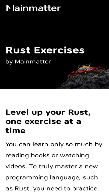 68%Mainmatter's Rust exercises blend theory and practice, forcing you to write code to solve tailor-made exercises while you get familiar with the theory behind them.