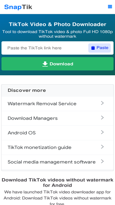 87%SnapTik.Net هو محمل فيديوهات تيك توك بدقة Full HD و1080p. يدعم تحميل فيديوهات وصور تيك توك بدون شعار أو علامة مائية بدقة HD 1080p و4K، 8K عبر المتصفح.