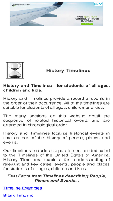 78%visit this site for history timelines of famous people, places and events. fast facts and information for students, children & kids via the history timelines. history and timelines provide a record of events in the order of their occurrence.