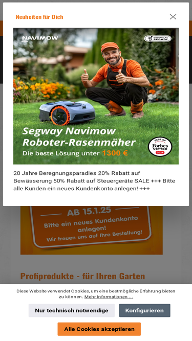 100%Willkommen im Hunter Beregnungsparadies 2026 Segway Navimow Mähroboter OHNE BEGRENZUNGSKABEL Der Segway Navimow ist wirklich der erste seiner Art. Dieser automatisierte Mähroboter verwendet eine virtuelle Begrenzung, wodurch eine komplizierte Verdrahtung der Begrenzung überflüssig wird. Der einfach zu bedienende und zu