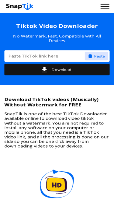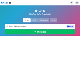 96%SnapTik is a free TikTok video downloader that allows you to download TikTok videos without watermark in MP4 format and HD, Full HD, or 4k quality. Using SnapTik you can save TikTok videos in mp4 format with no watermark to your phone or PC.