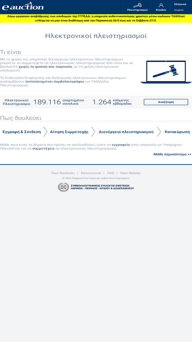 πλατφόρμα διενέργειας ηλεκτρονικών πλειστηριασμών οι οποίοι διενεργούνται σύμφωνα με τις διατάξεις του κώδικα πολιτικής δικονομίας όπως ισχύουν, από συμβολαιογράφους οι οποίοι είναι οι υπάλληλοι του ηλεκτρονικού πλειστηριασμού. - eauction.gr