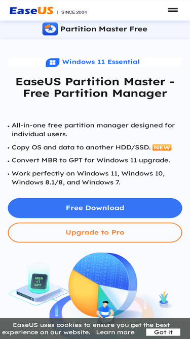 100%EaseUS Partition Master Free is a free partition software that can partition hard drive and reoragnize the disk space for better performance. You can resize,move, merge and create partitions for Windows 11/10/8/7/Vista/XP.