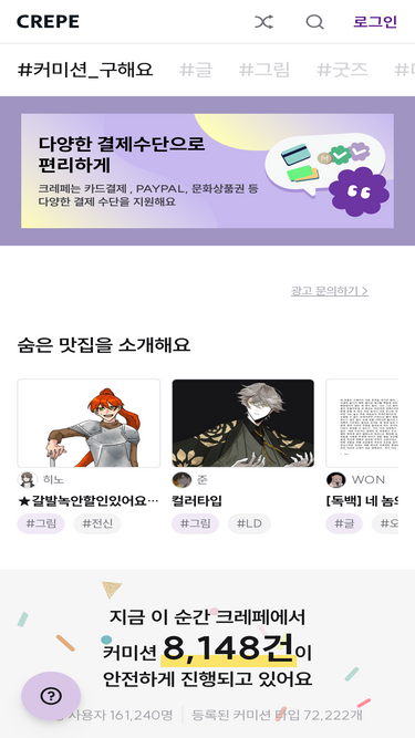 96%CREPE는 한 사람만을 위한 창작물을 안전하게 주고받는 플랫폼이에요.