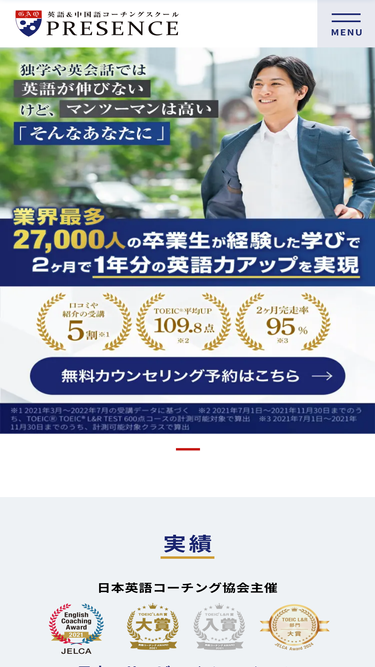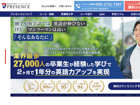 65%独学や英会話では英語が伸びないけど、マンツーマンは高い。「そんなあなたに」PRESECNEのコーチングでしか味わえない高いコストパフォーマンスと2ヶ月後の達成感。業界最多27,000人の卒業生が経験した学びで2ヶ月で1年分の英語力アップを実現。