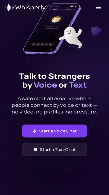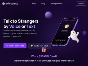 96%Chat safely with strangers online by voice or text — no video, no login, no fake profiles. Whisperly is the most human and secure Omegle alternative in 2025.