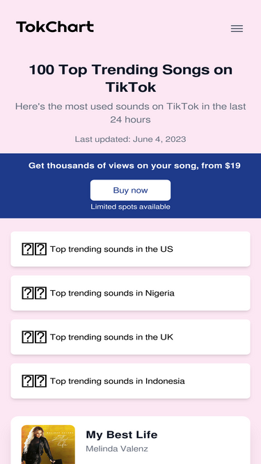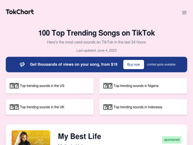 100%explore the top trending songs on tiktok today and this week. get the latest on popular tiktok hits 2024 and trending tiktok original sounds on tokchart.