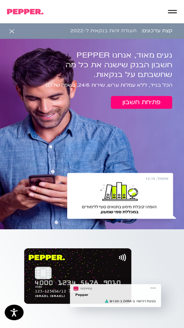 87%נעים מאוד, אנחנו PEPPER - חשבון הבנק שישנה את כל מה שחשבתם על בנקאות! הכל בנייד, ללא עמלות עו“ש, שירות 24/6, בשפה שלכם. רוצים ללמוד על כל השירותים שלנו? היכנסו!