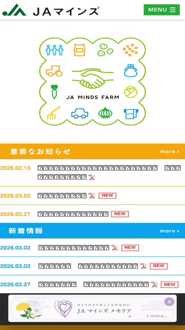 93%jaマインズの公式ホームページです。東京都府中市・調布市・狛江市を管内とするjaです。当サイトでは、管内の生産者・農産物・直売所や、営農指導・販売・金融などのjaの各事業について、組合員・地域の皆様に役立つ様々な情報を発信しています。