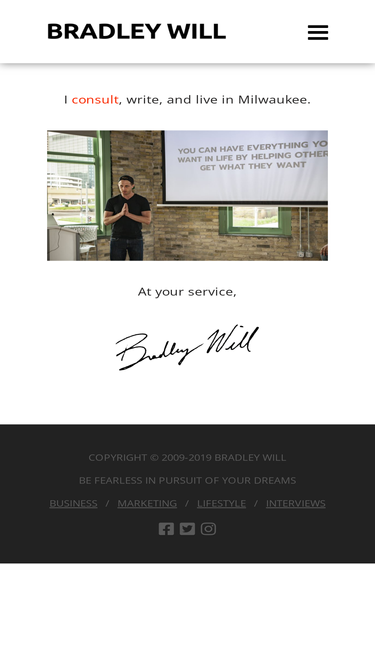 78%i'm bradley will. i'm a serial entrepreneur, writer, and marketing consultant that helps small businesses grow and make a greater impact in the world.