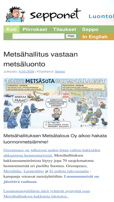 59%Pilapiirroksia, luontokuvia ja huumoria luonto- ja ympäristöaiheista.