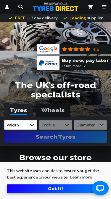 63%welcome to tyres direct – the experts in 4x4 tyres and wheels. based in clophill, bedfordshire, we stock a wide variety of products from car tyres to suv wheels.
