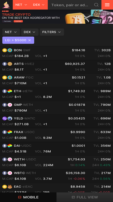 100%Explore 825 Crypto DEX exchanges with a 6382762 DeFi coins and tokens and 7819985 trading pairs.