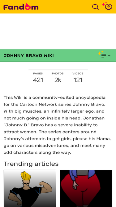 78%Welcome To the Johnny Bravo Wiki! This Wiki is a community-edited encyclopedia for the Cartoon Network and Hanna-Barbera series Johnny Bravo. With big muscles, an infinitely larger ego, and not much inside his head, Jonathan "Johnny B." Bravo has a severe inability to attract women. The series centers around Johnny's attempts to get girls, please his Mama, go on various misadventures, and meet many odd characters along the way. Around the Wiki