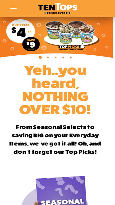 78%At Ten Tops we know value, that's why EVERYTHING in our stores is $10 or less. Yep - it's that simple, NOTHING in store is over $10.