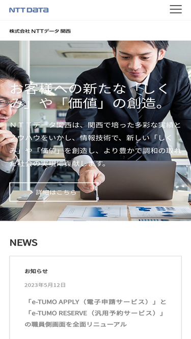 60%NTTデータ関西のWebサイトです。NTTデータ関西がご提供いたしますサービスやソリューション、 企業情報をご紹介いたします。関西で培った多彩な実績とノウハウをいかし、 情報技術で、新しい「しくみ」や「価値」を創造し、より豊かで調和の取れた社会の実現に貢献します。