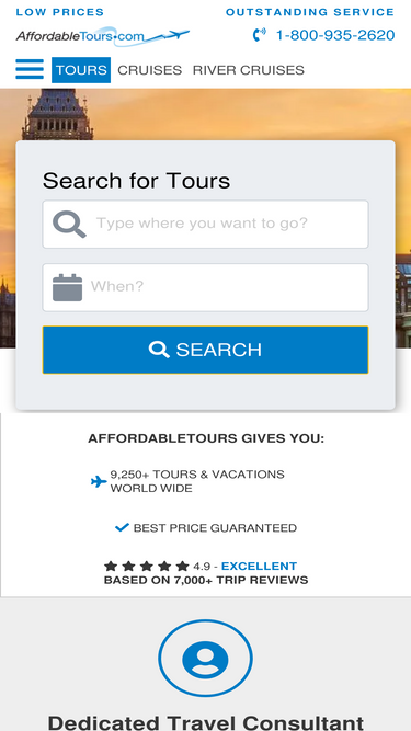 98%Discover affordable tours, cruises, river cruises, and vacation packages across Europe, Asia, and beyond. Book with AffordableTours.com and save up to 40% on...