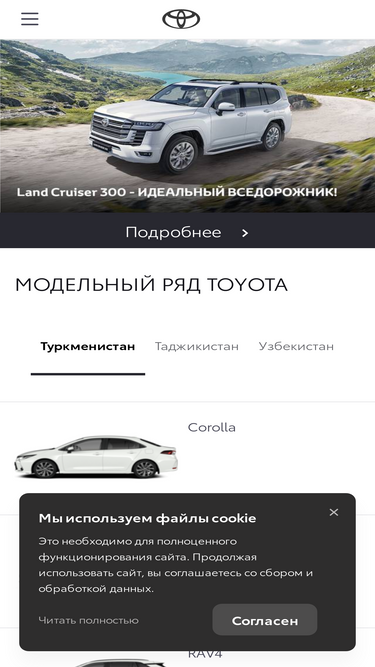 95%Официальный сайт Toyota в Центральной Азии: Цены на автомобили Toyota в Ташкенте. На сайте представлена информация о ценах на новые автомобили Toyota, а также указаны официальные дилеры Тойота в Ташкенте, Душанбе и Ашхабаде