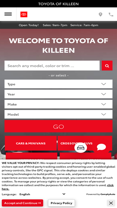 83%visit our toyota dealership in killeen, tx, to buy or lease a new toyota car. take a test-drive, finance a new toyota nearby or schedule auto service.