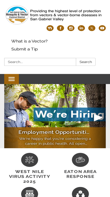 80%san gabriel valley mosquito and vector control district monitors and controls vectors and the diseases they can spread. our services and programs protect public health from mosquito-borne diseases.