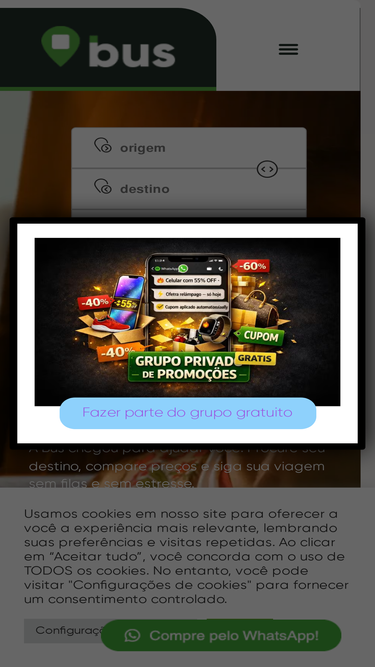 92%Escolha seu destino e viaje pagando mais barato! Mais de 5 mil destinos para você chegar exatamente onde precisa! Aproveite nos descontos 5% OFF Desconto de 5% nas suas passagens com a Bus! Válido somente naVálido somente na primeira compra CUPOM5 Expira: 30/10/2022 Como utilizar o cupom de desconto? Escolha seu destino Selecione seu ponto