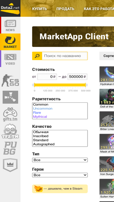 68%первая торговая площадка dota 2, на которой любой человек может не только купить понравившимися ему dota 2 предметы, но и абсолютно автоматически выставить свои dota 2 предметы на продажу и получить реальные деньги на интернет-кошелек.
