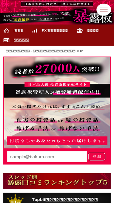 95%情報商材「暴露板掲示板」では、情報商材を自由にユーザーがレビュー評価できる日本最大級の口コミ掲示板サイトです。fx、株、バイナリーオプションなど投資系のオファーなどの暴露情報を入手できます。自作自演、荒らし行為、誹謗中傷に該当する書き込みは無条件で削除対応される信頼のおける掲示板です。