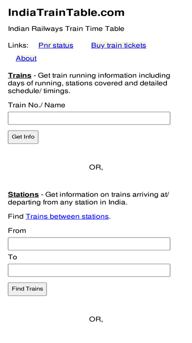 indiatraintable.com is one stop website for indian railways train time table. find trains between any two stations and get information on arrival and departure times of all trains, station-wise train schedule.