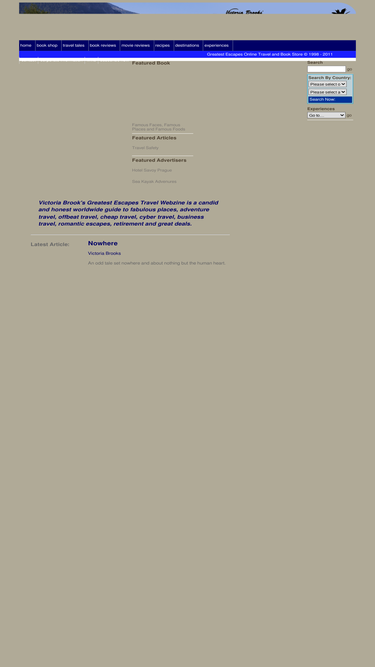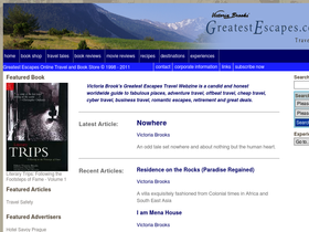 100%greatest escapes travel webzine is updated monthly with up-beat, fun travel articles and reviews by well-known travel writer victoria brooks and her guests.