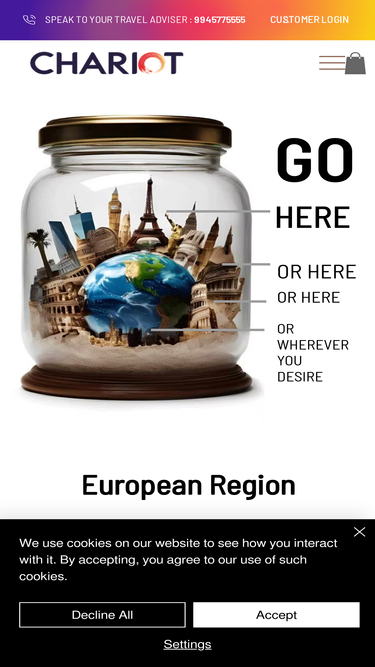 Fixed Departure International Group Tours and India Tours from Bangalore. Regular departures to Europe, Australia, New Zealand, Japan, USA, South America and a whole lot of other destinations across the world. Chariot World Tours, the oldest and largest group tour company in South India