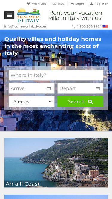 100%Rent your vacation villa or apartment in Italy. Villas, apartments and vacation houses in Amalfi, Positano, Capri, Sorrento, Cilento, Tuscany, Umbria, Rome, Venice, Lake Como. Descriptions, pictures and rates of Italian holiday homes.