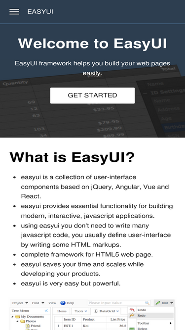 80%easyui is a complete framework for html5 web page. it provides easy to use components for building modern, interactive, javascript applications that work on pc and mobile devices.