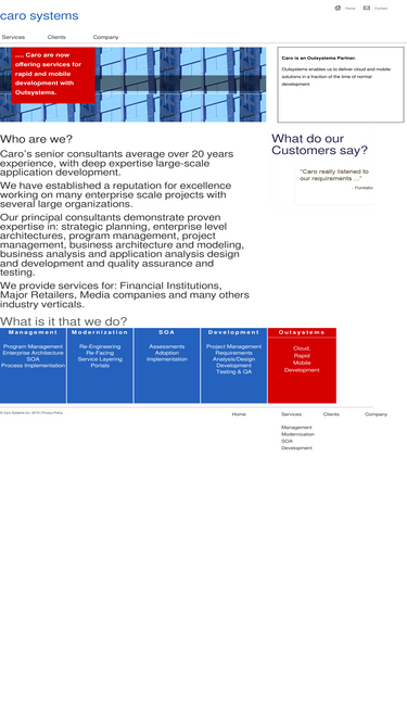 100%caro systems inc. - a software consulting and development company. caro’s senior consultants have over 20 years it experience, each with deep expertise in application development and iterative, model-driven development processes such as ibm’s rational unified process.