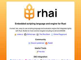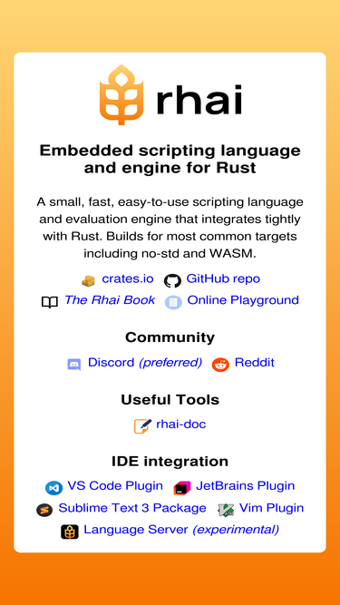 76%embedded scripting language and engine for rust. a small, fast, easy-to-use scripting language and evaluation engine that integrates tightly with rust. builds for most common targets including no-std and wasm.
