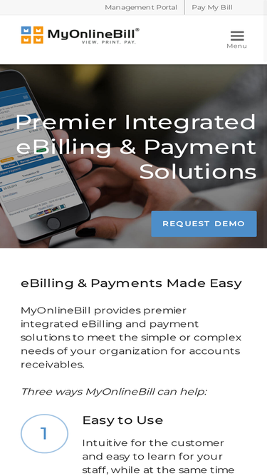 72%Company Headquartered in Irvine, California, MyOnlineBill provides premier integrated eBilling and payment solutions. Testimonials Hear from a few of our clients on how our solutions are helping their business. Security & Compliance All the security, reliability, and compliance you require for accepting payments. Annual audits provide you with piece of mind that your data is safe.