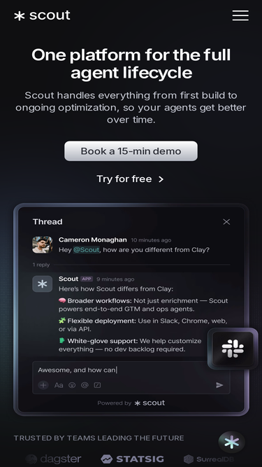 86%tryscout.ai's top 5 competitors in February 2026 are: getscout.ai, scoutnow.ai, scoutco.ai, scoutos.com, and more.