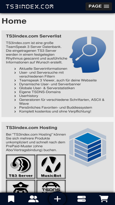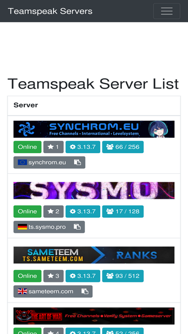 100%TeamSpeak Server List and Hoster. TS3 and TS6 servers are indexed and viewers for your own homepage, dynamic live banners and statistics are created.
