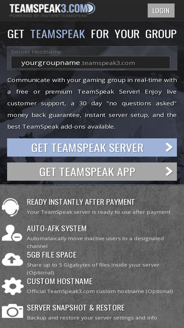 63%teamspeak3.com offers affordable teamspeak server hosting for your group or organization. create your teamspeak server on our premium voice communication network and enjoy live customer support, a 30 day