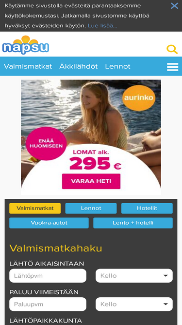 80%Napsu on suomalainen matkailusivusto, josta löydät valmismatkat, äkkilähdöt, lennot ja hotellit.