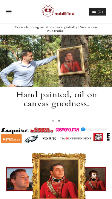 83%Couldn't find what you were looking for among our selection of emperors, Kings and pin up models? Looking to commission something that only you could come up with? We can help with that! Whether you would like to be an elf, travelling through middle-earth, or a character from your favourite video game, or even an album cover; at Nobilified we work hard to make even your most ridiculous ideas come to life! We can paint more than one person on a canvas, so that you can nobilify yourself and your friends in a group painting! The best part is, we make it incredibly easy to unleash the hero in you! Just follow these three simple steps: . Select the number of pets or people in the painting. . Upload a picture of the character you wish to become . Upload a photo of your face . Upload additional items you wish to add . Select a painting size We'll take care of the rest! We can even paint more than one person in each painting!