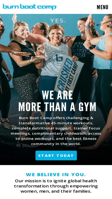 98%Burn Boot Camp is a boutique fitness concept where like-minded women come together, build confidence, and inspire one another through fitness. Camps are offered multiple times throughout the day, last 45 minutes, and are comprised of 72 different styles and 15 different formats. Workouts take place on our proprietary Floating Floor with individualized attention in a group fitness setting. Clients learn far more than just healthy eating and exercise tips at Burn Boot Camp, as the concept strays from the competition by operating on a five pillar philosophy to help clients achieve success: mindset, whole food nutrition, burst training, strength training and positive environment.