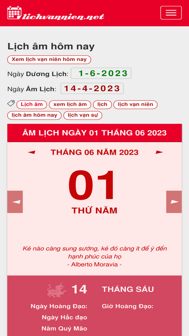 100%Xem lịch âm ngày 15 tháng 6 năm 2025 - Lịch vạn niên ngày 15/6/2025 - Xem lịch vạn sự 15/6/2025 - Lịch âm dương 15/6/2025 - Lịch ngày tốt hôm nay 15-6-2025 để biết ngày tốt (hoàng đạo) ngày xấu (hắc đạo), giờ tốt xấu. Ngày 15/6/2025 có phải ngày tốt không?
